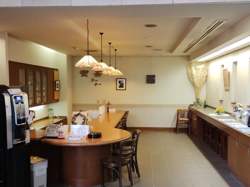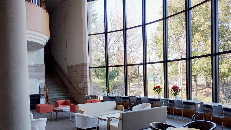 誰でも利用できる大ロビーは、吹き抜けの大ガラスから見える緑が目に優しく、その一角は喫茶コーナーになっています。